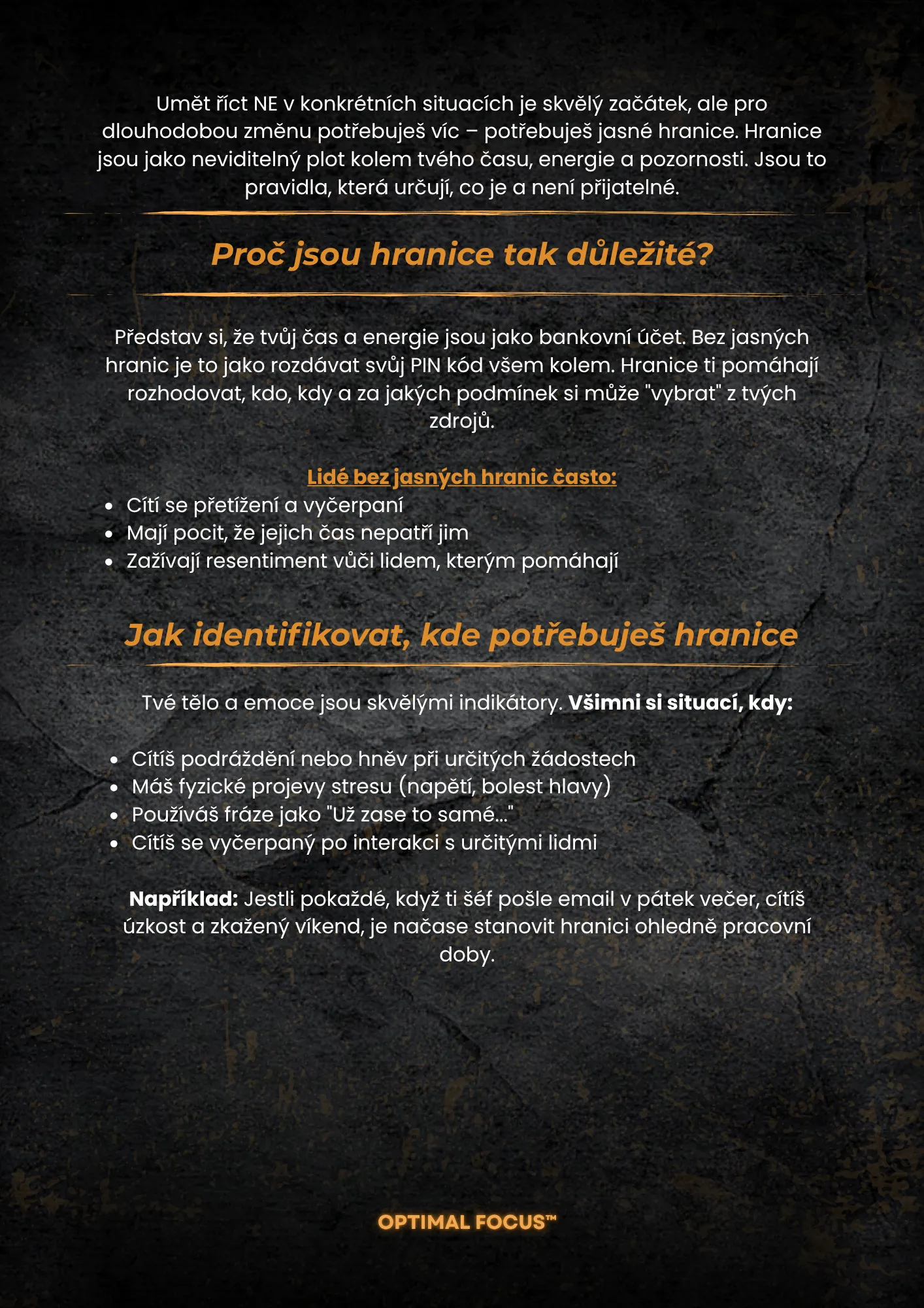 Ahoj, mě se nejvíc líbila kapitola o vytyčení vlastních hranic, což je pro mě aktuální a taky ty příkladové věty, které si upravím ke svému. Děkuji za ten přístup!